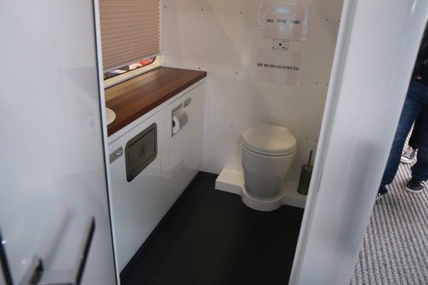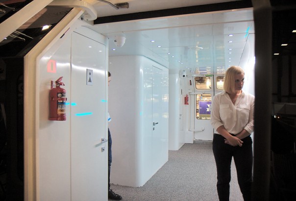 Или, например, рубка капитана судна. Она очень компактна, но очень удобна. Чтобы сесть в кресло, не нужно его обходить — оно установлено в поворачивающемся модуле, и вращается на 360%. И сидишь как будто не в рубке судна, а в рубке небольшого космического корабля. Видео на главный обзорный экран передается с нескольких камер, уставленных по периметру корпуса. Вокруг приборы, кнопки, в руках два джойстика управления двигателями напоминающие РУДы самолета, но управляют они не только тягой, но и курсом. Поэтому никакого штурвала нет, каждый из двух двигателей управляется независимо, за счет чего обычно неповоротливый катамаран может развернуться почти на месте.