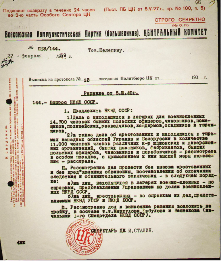 Мы видим, что на Решении о расстреле поляков от 1940 года стоит печать КПСС. А ведь наша партия была переименована в КПСС только в 1952 году.
