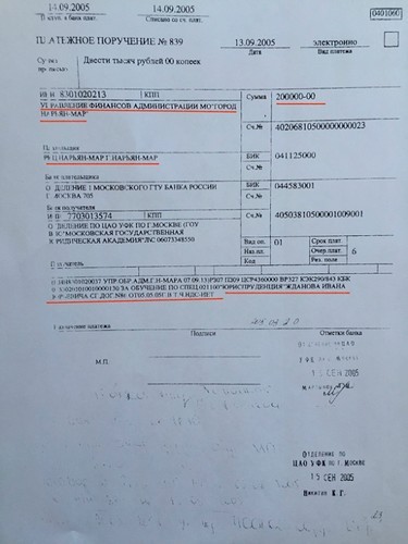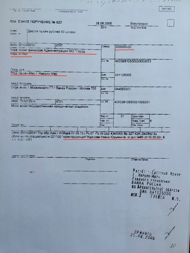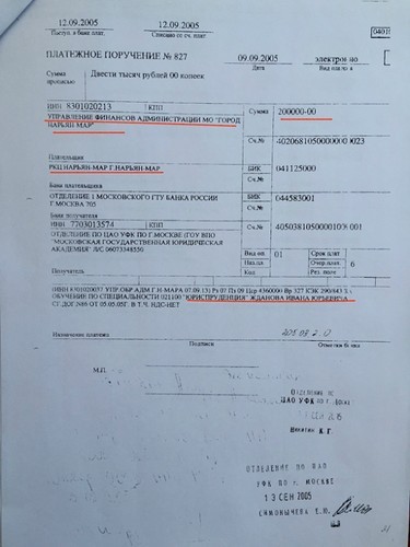 Что интересно, учился парниша на внебюджете. А оплатил обучение этого нью-москвича в Московской государственной юридической академии им. О.Е. Кутафина (барабанная дробь) город Нарьян-Мар! Это папа устроил судьбу сына, перечислив на счет академии 600 тысяч рублей тремя платежами по 200 тыс. В 2005 году это были огромные деньги. Примерная стоимость однушки на выселках в Москве. Понятное дело, чадолюбивый отец решил сэкономить собственные средства, отжав их у горожан. Понятное, но незаконное. Что и подтвердила прокурорская проверка.