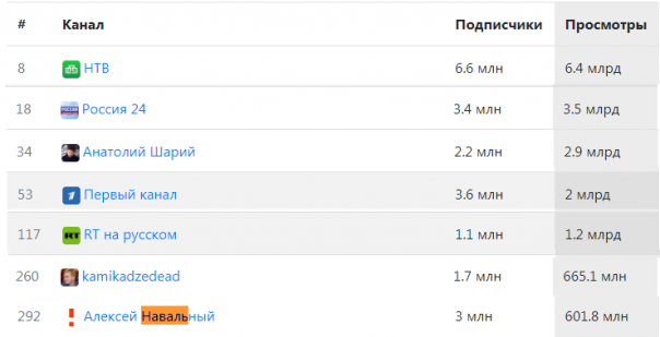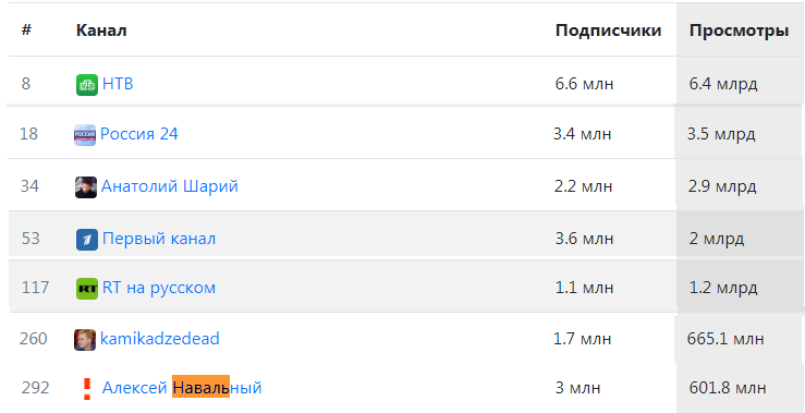 Вот так выглядят каналы с наибольшим кол-вом просмотров. Подборку делал вручную, поэтому мог ошибиться. Навальный, Дудь, камикадзе и другие далеко отстают.
