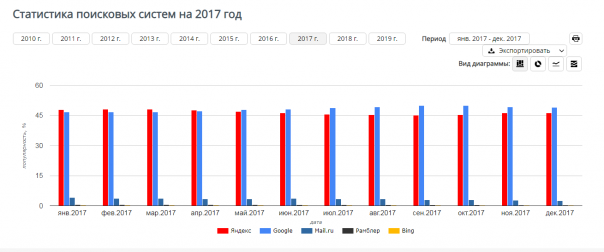 Прошу заметить при этом, что Россия на фоне других стран выглядит более чем достойно. У нас в стране вполне успешно Яндекс много лет удерживал первое место с хорошим отрывом, но в 2017 году уступил гуглу.