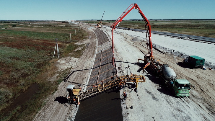 В строительстве автодороги используют уникальную для региона спецтехнику — бетоноукладчик, маневренный, технологичный для перегрузки и распределения бетонной смеси. Бетоноукладчик заменяет 3 бригады рабочих.