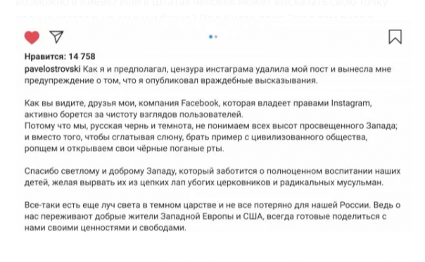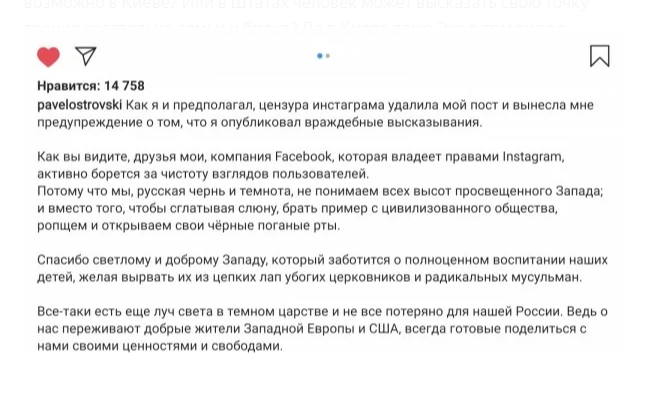 Смотришь СЕЙЧАС бабченку на Эхе и плавно офигеваешь. В РОССИИ ЦЕНЗУРА????? ПРАВДА??? А выступление на радио ополченцев Донбасса возможно в Киеве? Или в Штатах человек может высказать свою точку зрения касательно семьи и брака? Да в Киеве даже Эхо в том виде в котором оно есть, пытается открыться при пожелании от нациков Венедиктову сдохнуть. Попробуйте высказать на Фейсбуке или Инсте точку зрения, что семья это ПАПА+МАМА))) Если аккаунт читаем, то, в лучшем случае, предупреждение или сразу бан и удаление аккаунта.