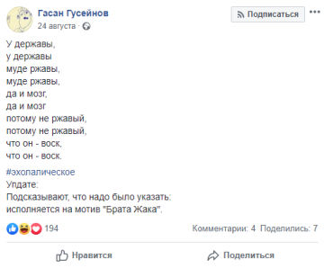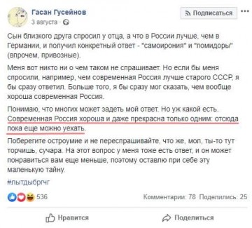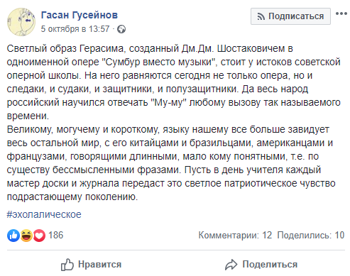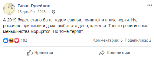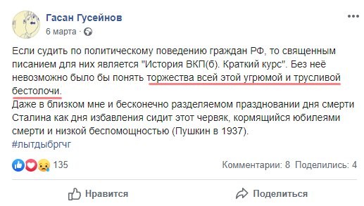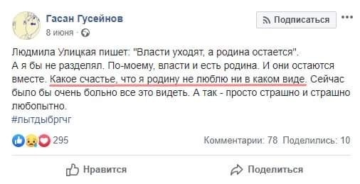 Первый вице-президент Центра политических технологий, профессор ВШЭ Алексей Макаркин: "Пост Гасана Гусейнова уже вызвал предсказуемую кампанию привычно оскорблённых с требованиями посадить, уволить, депортировать".