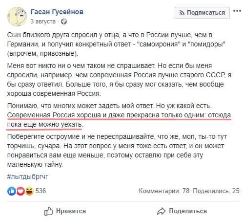 "Кроме шуток: я и в самом деле не люблю Россию. Не только политический режим, но и культуру, например" (Г. Гусейнов).