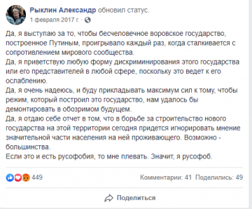 Далее он переключился непосредственно на сам праздник, выразив уверенность в его «бессмысленности» и «ненужности». Само собой, мнение Рыклина не совпадает с мнением большинства граждан России, ведь согласно опросам того же ВЦИОМ, результаты которого были опубликованы практически одновременно с опусом Рыклина, более 65% россиян считают празднование таких дат важным и нужным делом. Впрочем, такое расхождение позиции недожурналиста с позицией граждан вполне объяснимо: он не скрывает того факта, что придерживается откровенной русофобской позиции: