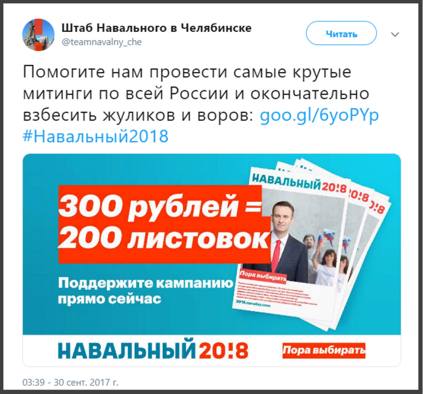 Для этого Леша открыл 81 штаб. Целью этих шарашек было распространение агитматериалов. Другими словами, призывов к участию в массовых мероприятиях и к бойкоту предстоящих выборов, если Наву не зарегистрируют. Леша хотел создать впечатление, будто его не допустят до выборов вовсе не за мошенничество и судимость, а по политическим причинам.