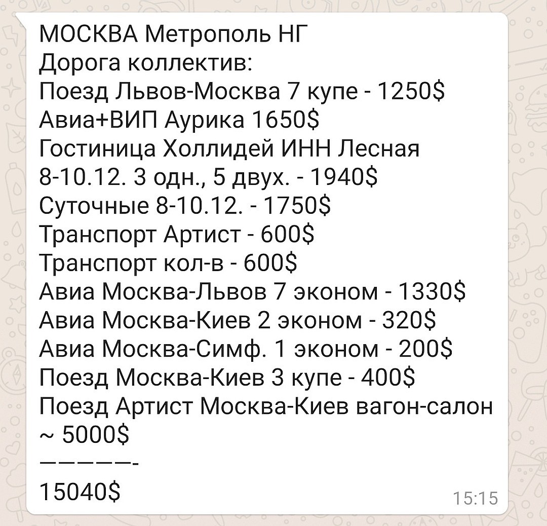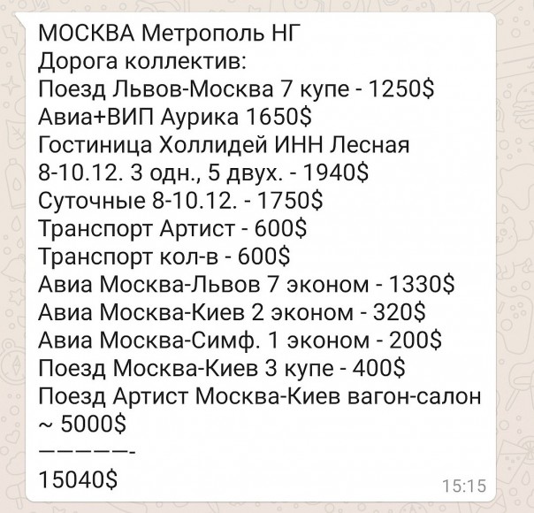 Генеральный менеджер одного из столичных агентств поделился с «Комсомольской правдой» результатами переговоров и переписки с менеджментом Софии Ротару о выступлении певицы: «Гонорар артистки на новогодний корпоратив в декабре нам объявили $60 тыс. (3,8 млн.руб.). Написали, что часть коллектива уже в Москве, София Михайловна живет в собственном жилье. Но есть дополнительные расходы - транспортные: на дорогу ее коллектива. В смете, которую мы получили было посчитано проживание в гостинице, транспорт, суточные. Коллектив певицы из разных городов, поэтому и билеты в смете обозначены из разных населенных пунктов. Кроме того, обозначен перелет бизнес-классом для сестры певицы Аурики. Итого транспортные расходы по смете для нашего корпоратива составили: $15040 (962 тыс.руб.). Но шла речь и о возможных скидках - все обсуждается. Несмотря на то, что наш заказчик - крупная корпорация были готовы оплатить выступление Софии Михайловны на новогоднем мероприятии, в итоге было принято решение перенести его на весну - на 8 марта. Хотя тогда цены будут выше, так как придется оплачивать транспортные расходы полностью».