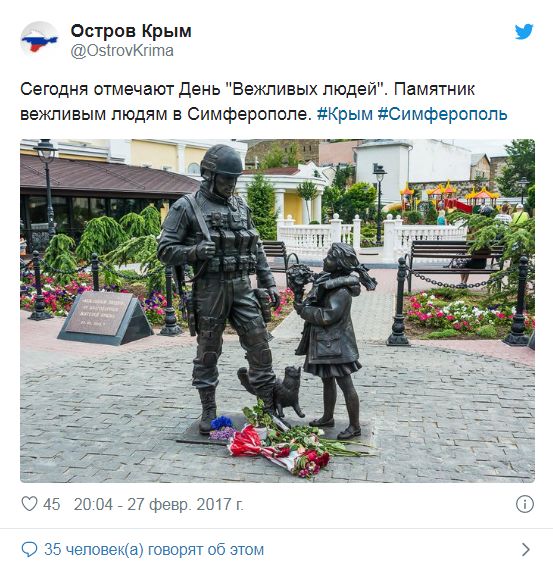 В Крыму, захваченном у Украины, установлен памятник так называемым «зеленым человечкам», которых в России называют «вежливыми людьми».