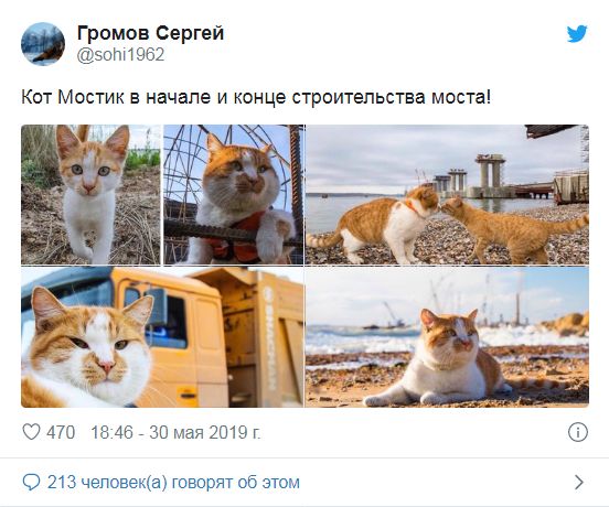 Когда строился автомобильный мост из России в Крым, строители завели кота. За жизнью кота, которого назвали Мостиком, активно следили в российских СМИ и социальных сетях — таким образом освещался и процесс строительства моста. Когда Крымский мост был готов, Мостик удостоился чести пройти по мосту прежде самого Путина.