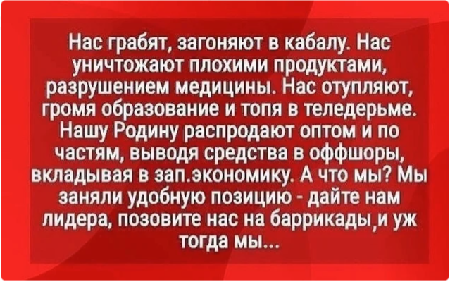 Вы вообще представляете, что такое р е в о л ю ц и я и баррикады? Вы готовы послать туда своего ребёнка, или как всегда надеетесь на других? Задал пару вопросов это женщине. Ответа не дождался.