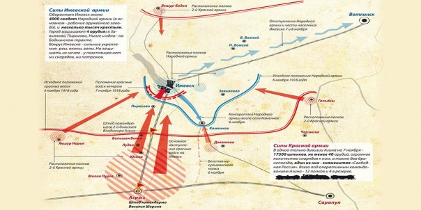 В этот же день большевики высадили с Камы речной десант — правда, наученные горьким опытом с поездами, не в самом Ижевске, а в Сарапуле, что в 60 километрах от него. Там у красных уже имелся штаб одной из армий, но не хватало самих войск. Руководил отрядом один из видных, на 1918-й год, красных командиров — сам Антонов-Овсеенко. В его распоряжении имелось около шести тысяч человек (самых лояльных — латышей, мадьяр и матросов), восемь орудий, десятки пулемётов.