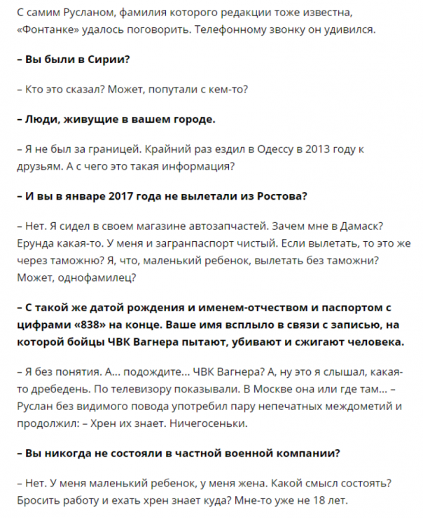 Найти того самого Руслана оказалось совсем нетрудно. По имеющимся в статье данным – имени, локации и роду деятельности, быстро удалось выйти на нужного человека. Того, да не того. Руслан был очень удивлен, когда ему позвонили из ФАН и сообщили о желании встретиться. Он рассказал, что не беседовал с какими-либо журналистами, и не представляет, как мог стать бойцом ЧВК «Вагнера», когда даже ни разу не побывал в Сирии и вообще никогда не участвовал в боевых действиях.