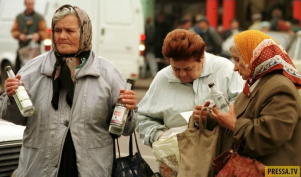 Пенсионеры продают дешевую водку в центре Москвы, сентябрь 1998 года