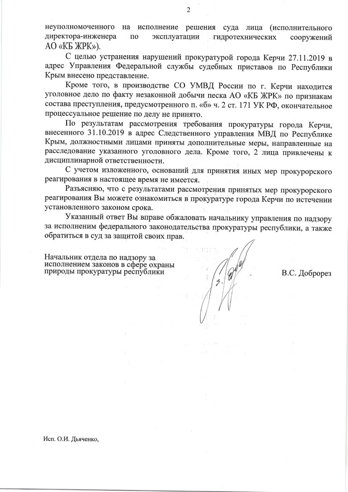 Не менее остро стоит проблема добычи песчаных пород в районе обводного канала Нижне-Чурбашского хвостохранилища. Напомним, определением Керченского городского суда от 18 июня 2016 года был наложен запрет на проведение работ АО «КБ ЖРК» в районе обводного канала. Однако работы продолжались всё лето и осень, вплоть до декабря текущего года.