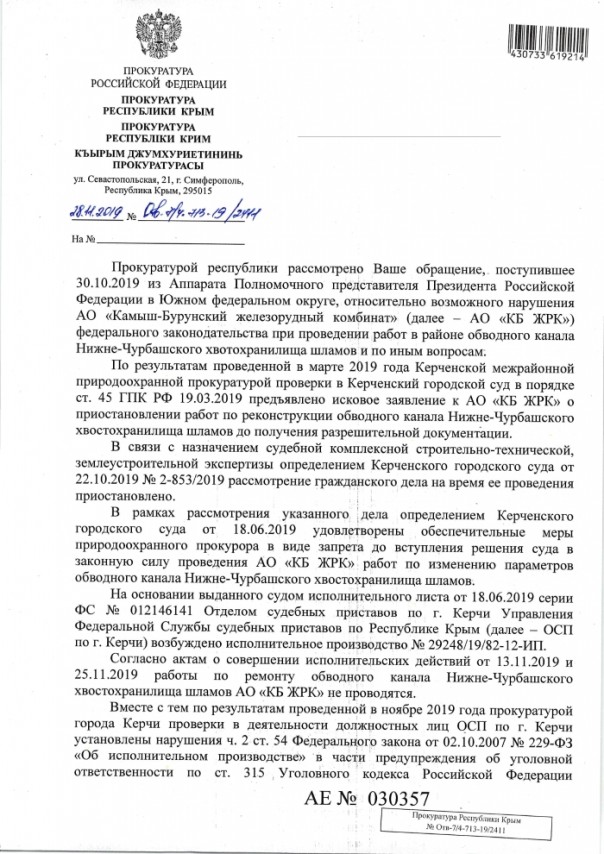 Также в судебном порядке были отменены и признаны незаконными постановления службы государственного строительного надзора Крыма о назначении административного наказания в отношении АО «КБ ЖРК». Комбинат привлекали к ответственности за выполнение реконструкции обводного канала без разрешительной документации.