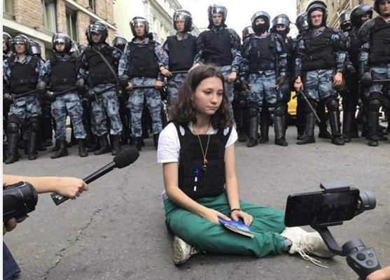 Во время протестов митингующие даже вели себя как в Гонконге. Вот фото оттуда, а вот Ольга Конституция, которая сидит ровно так же около сотрудников ОМОНа.