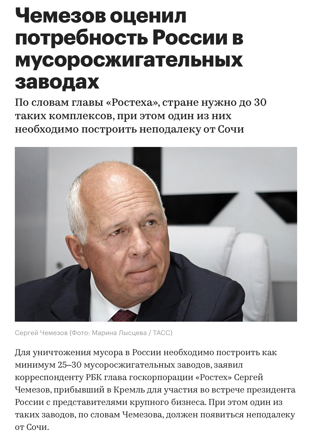 P.S. Только в одном моменте не соглашусь с Чемезовым. В стране нулевого захоронения Швейцарии сейчас действует 30 мусоросжигательных заводов совокупной мощностью в 2,8 млн тонн в год (слабенькие и большей частью устаревшие, еще прошлого века, сейчас мощность подмосковных 700.000 тонн, казанского 550.000).