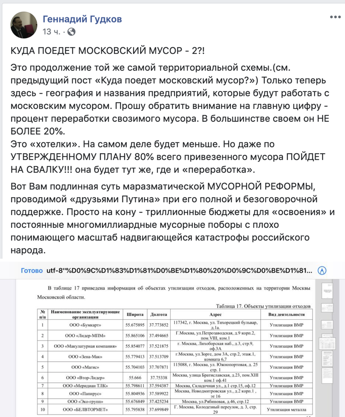 В своем посте Гена наскринил таблиц с перечнем предприятий, имеющих отношение к утилизации мусора и визжит, что там будут захоранивать отходы. Например, улица Складочная, дом №15, офис №12. Прямо в офис и повезут, самосвалами. Или на 16-м этаже дома №2 по улице Новодмитровской. Бедные, бедные москвичи.