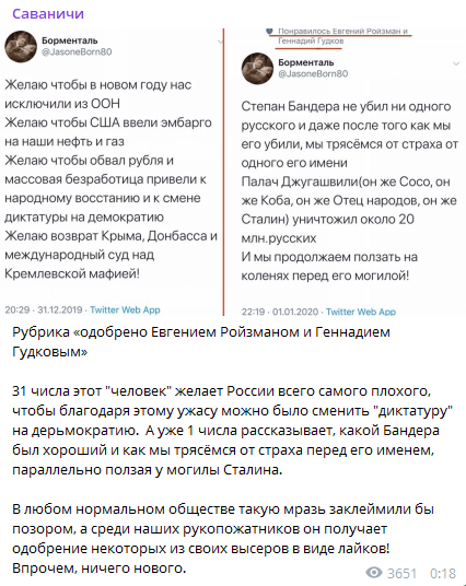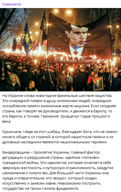 Ну ладно укры. У них вообще мода на искажение истории. Укронацисты и 1 января провели факельное шествие в честь своей «иконы». Однако ужас момента в том, что и наши либералы не видят противоречий между сказанным Зеленским о праве на национальное самосознание и почитанием укронацика, запачканного русской кровью не меньше Гитлера.