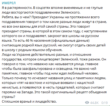 Зеленский, к слову, говорил точь-в-точь как персонаж Голобородько, роль которого он долгие годы исполнял в сериале «Слуга народа». Это для него куда более привычная работа (надевать маски и лицедействовать), нежели президентство. Но за популистскими речами ничего не стоит: 31 декабря президент Незалежной говорит о том, что в любом конце страны защищают свое право на родной язык, и в этом все украинцы похожи, а уже 1 января в Киеве празднуют день рождения Степана Бандеры.
