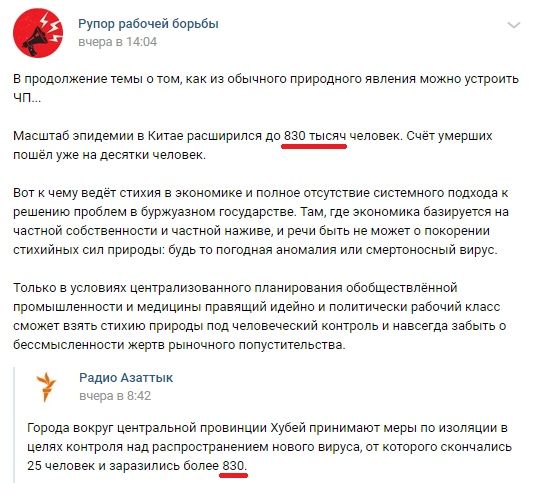 Знаете, что они вещают уже двое суток? Что «в Китае эпидемия из-за того, что там не плановая экономика» и «при коммунизме вирусов не будет».