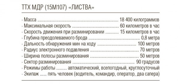 МДР «Листва», или машина дистанционного разминирования 15М107, относится к оружию на новых физических принципах (микроволновому). Размещена на базе бронекорпуса СБА-60-К2 «Булат» (трехосный бронеавтомобиль «изделие 69501» производства КамАЗ).