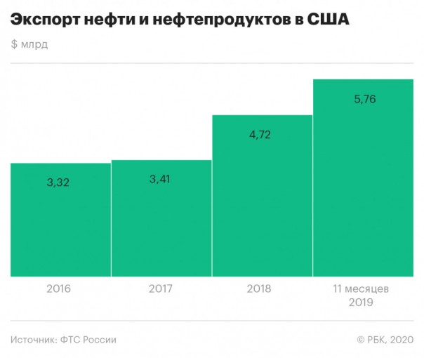 В стоимостном выражении экспорт российской нефти в Америку увеличился за январь—ноябрь 2019 года с $0,74 млрд до $1,95 млрд, указывает ФТС. Россия также поставила в США нефтепродуктов на $3,8 млрд.