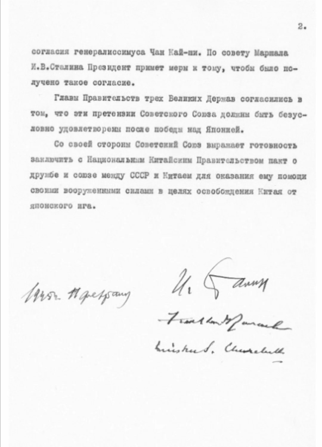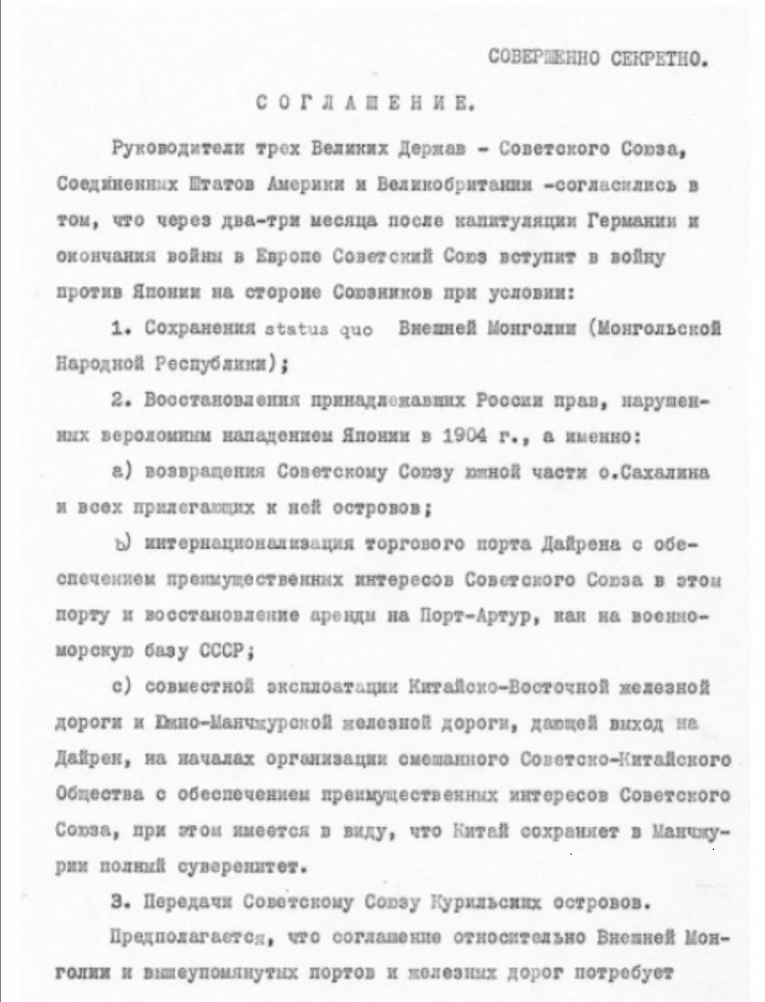 Руководители трёх Великих Держав- Советского Союза, Соединённых Штатов Америки и Великобритании- согласились в том, что через два-три месяца после капитуляции Германии и окончания войны в Европе Советский Союз вступит в войну против Японии на стороне Союзников при условии: