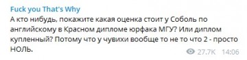 Это значит одно: Любовь Соболь не заканчивала юрфак главного института страны – МГУ. Ведь там очень сильный английский, оттуда просто невозможно выйти с таким уровнем языка, как у Любы. И все отмазки о том, что она отвыкла и давно не практиковалась – это бред. За несколько дней подготовки она бы восстановила произношение. Но если его не было изначально, то и восстанавливать тут нечего.
