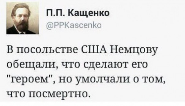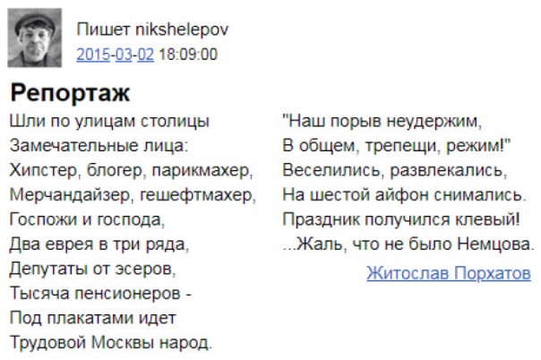 Сегодняшний "Марш памяти Бориса Немцова" в Москве приурочен к пятой годовщине бесславной гибели абсолютно аморального субъекта, долларового миллиардера и несостоявшегося ельцинского преемника. Через считанные минуты после смерти Бориса Ефимыча причислили к "пантеону героев-мучеников" российской либерды. Он достойно вписался в компанию Галины Старовойтовой, Сергея Юшенкова, Анны Политковской (Мазепы), Александра Литвиненко, Сергея Магнитского. Какова оппозиция, таковы и герои. Что касается гибели Немцова, отнюдь не случайно возникло двустишие "Герои гибнут на посту, а не с ******* [путанами] на мосту".