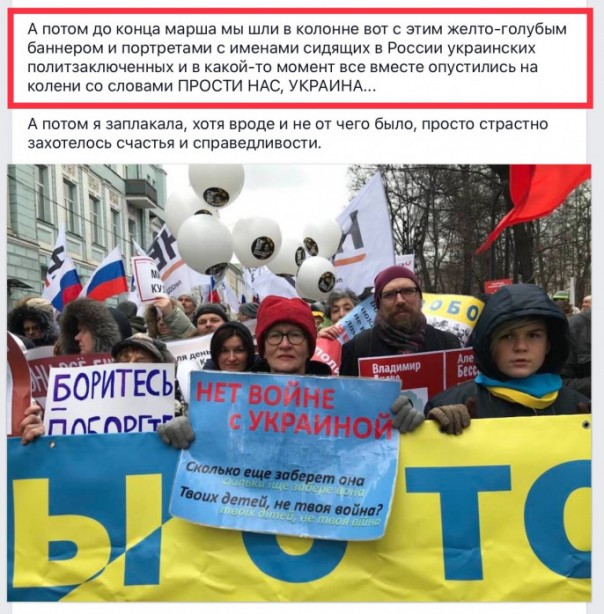 По итогам тиснула в Facebook проникновенный текст, заканчивающийся словами: "А потом до конца марша мы шли в колонне вот с этим жёлто-голубым баннером и портретами с именами сидящих в России украинских политзаключённых и в какой-то момент все вместе опустились на колени со словами ПРОСТИ НАС, УКРАИНА... А потом я заплакала, хотя вроде и не от чего было, просто страстно захотелось счастья и справедливости".