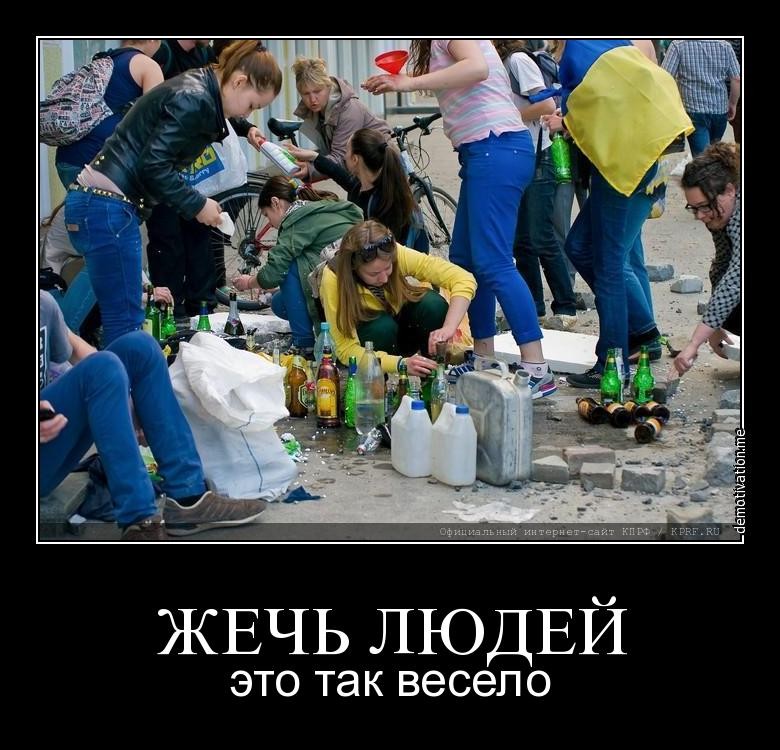 Чем особь с мерзопакостным плакатиком отличается от этих особей, помогающих жечь "колорадов" и "ватников"? Только одним - она пока не перешла к практическим действиям по реализации своих человеконенавистнических установок. Но морально она и ей подобные "любители свободы" и "борцы за все хорошее" к таким действиям уже готовы.