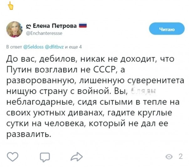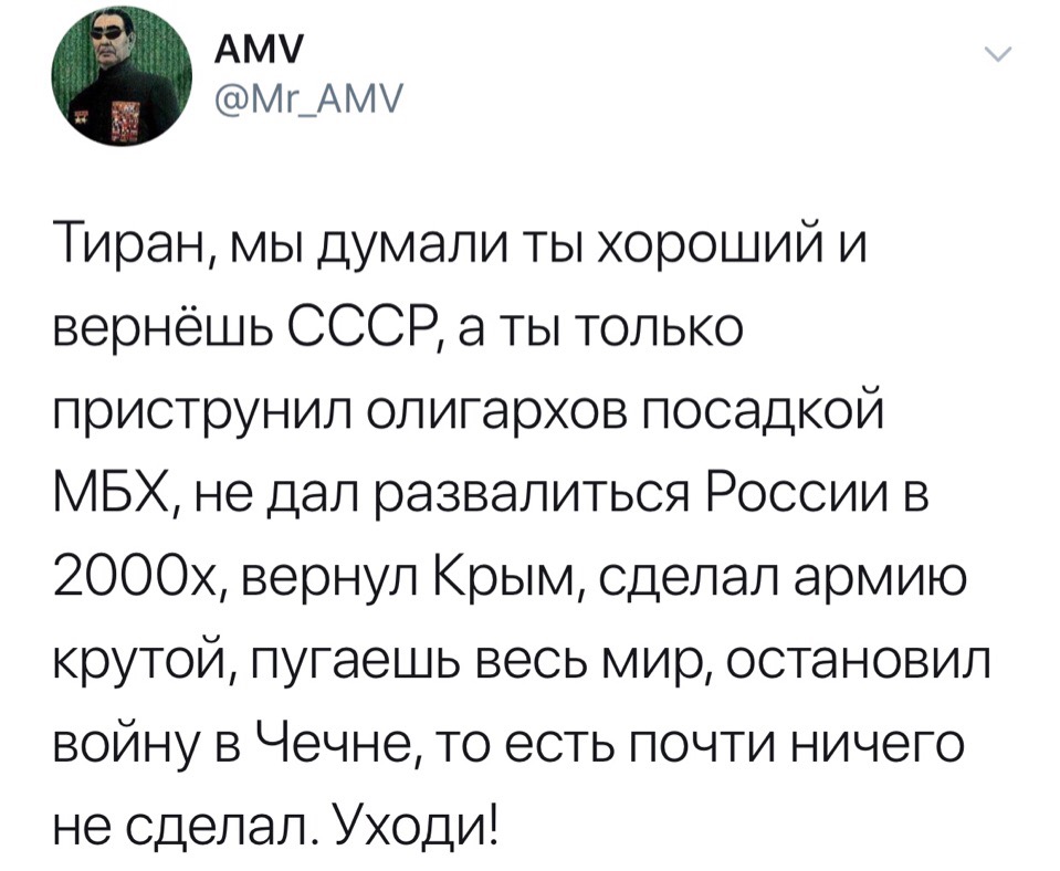 Путин остановил не только Войну, Путин остановил геноцид, Путин остановил распад России и именно поэтому я за него голосовал, я осознаю какую колоссальную работу этот человек проводит, потому что я жил в ссср с грязными дорогами, без фонарей, в стране бараков и дешёвого портвейна, в стране где продавцы-крысы прятали от людей творог и колбасу под прилавок, в стране очередей и сумасшедшей идеологии, в стране которая превратила людей в массовку, в тупых алко-баранов с радостью поменявших первомайские на перестроечные митинги, алко-баранов с ликованием побежавших менять свои заводы, санатории, комсомольские и партийные билеты на вкладыши от жвачки, ваучеры и фантики "МММ".