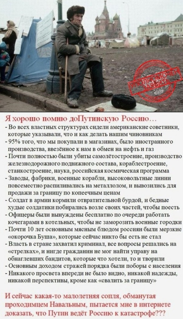 Я жил в девяностые, технический спирт вместо водки, ОМОН который после чеченских командировок стреляет по машинам в Москве из автоматов, бандиты выпиливавшие себя и коммерсантов из жизни, как будто бы играя с дьяволом в квест. 1992 год, Москва, школа, раз в месяц нам выдают американскую гуманитарную помощью, пачка сухого молока и банка соевых сосисок. Я помню, как гопники снимали в центре столицы кроссовки и другие приглянувшиеся им вещи, я помню, кидал, катал, разводил на Арбате, я помню детей живших в Москве в канализационных люках и под платформами на Казанском вокзале, я помню огромные толпы шлюх строящихся на Тверском бульваре. На Фрунзенской у метро продавались солдаты-проститутки, а на Китай Городе продавались малолетние подростки (в основном из регионов) которых увозили машины с депутатскими флажками вместо номеров, я пережил это время и выжил — я выжил, что бы сегодня поддержать нашего президента и не давать лжецам на него клеветать или пытаться врагам возвеличивать проклятое народом и страной время!?