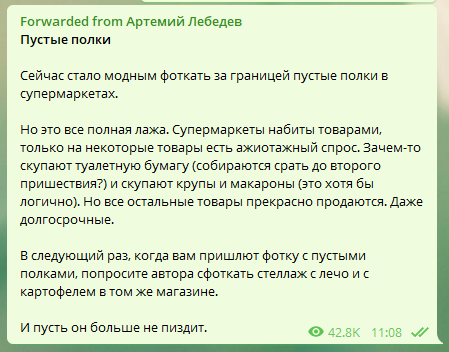 Известные личности также призывают сохранять трезвость ума и не поддаваться на дезу о якобы пустеющих продуктовых магазинах у нас и за рубежом. В своем Телеграм-канале в свойственной ему грубоватой манере Артемий Лебедев призвал фотографировать «стеллажи с лечо».