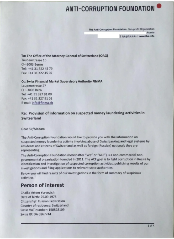 Алексей Навальный возлагал определенные надежды на вероятное расследование в Швейцарии, которую он назвал "ключевым регионом" для высокопоставленных российских чиновников. Прокуратура Швейцарии подтвердила, что Фонд борьбы с коррупцией 8 декабря 2015 года направил в генеральную прокуратуру Швейцарии жалобу против Артема Чайки, сына генпрокурора РФ.
