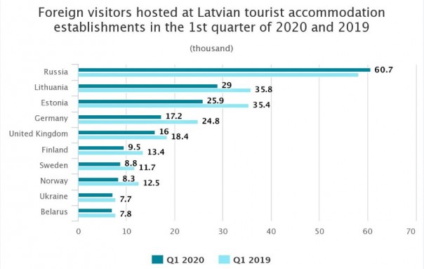 Латвиястат сообщает. 1 квартал 2020. Въездной туризм иностранных граждан в Латвию (83% прибытий - в столицу, в Ригу). Уже в разгаре мировой экономический кризис. Уже ноют из тысяч интернетных утюгов обнищалые и доедающие последний .... без соли россияне (интернет на последние копейки оплатили, вместо еды!). Уже и вирусная история вышла за пределы Китая. Границы, по крайней мере в январе-феврале, страны ещё не закрывают, но как бы надо бы и собственную голову на плечах иметь. Ладно. Короче. Просто посмотрите внимательно на этот график: