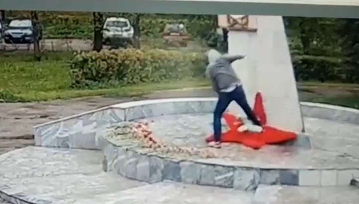 На кадрах видно, как мужчина в капюшоне и с плеером сначала мирно прогуливается возле обелиска, потом забирается на постамент и начинает ногами уничтожать венок в виде пятиконечной красной звезды, а потом — топтать возложенные к памятнику цветы.