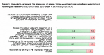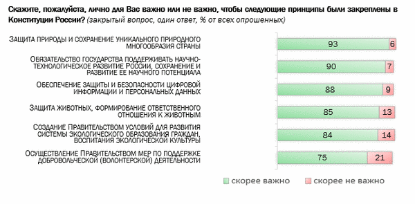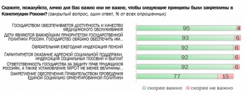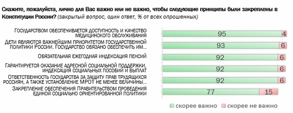 Абсолютное большинство россиян считают важным внести в Конституцию поправки, затрагивающие социальную сферу. Возглавляет список поправка об обеспечении государством доступности и качества медицинского обслуживания: 95% заявили о важности, считают это неважным 4%.
