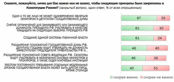 Завершает список важных политических поправок регулирование местоположения отдельных федеральных органов государственной власти и разрешение им пребывать в городе, отличном от столицы (40% считает важным, 51% — нет).