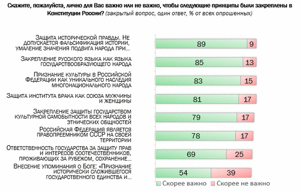 54% россиян считают важным внести упоминание о Боге: «Признание исторически сложившегося государственного единства и преемственности в развитии страны, с опорой на память предков и веру в Бога». Сочли это неважным 39% россиян.