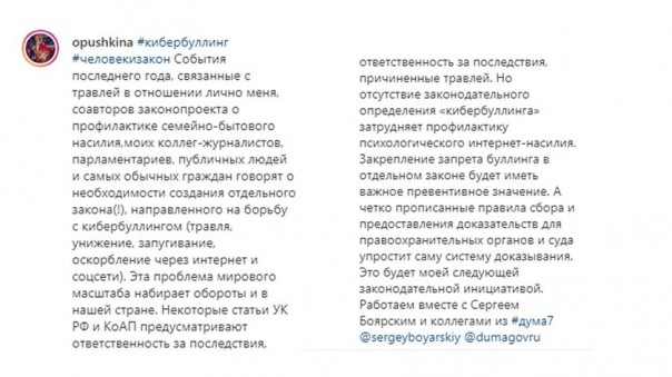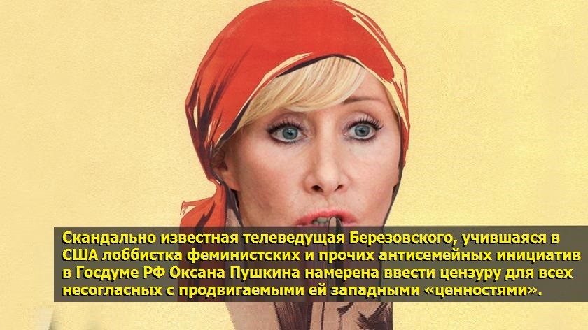 Но и этого мало. Оксана Пушкина намерена ввести цензуру для всех несогласных с продвигаемыми ей западными «ценностями». Яростно вопя, что её травят, Пушкина выступила с инициативой принятия закона о булинге: