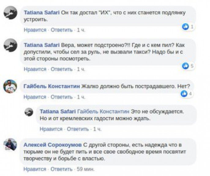 В либеральном сегменте соцсетей бухую особь предсказуемо объявили жертвой режима. Всё подстроила "кровавая гэбня". Оппозиционный Twitter-аккаунт ЯR: "Ефремов был и останется для меня Человеком с большой буквы. Да, сел за руль пьяный. Да, устроил ДТП. Но если бы он сам погиб в этой аварии, то в России стало бы одним порядочным человеком меньше. Все, кто его ******** сейчас — ***** и ********. Спасибо, что живой, короче". Маститые либералы Максим Кац и Роман Доброхотов обвинили в случившемся власти, которые не поставили в том месте отбойник. Лучи поддержки послал экс-актёр, сексуальный извращенец и русофоб Алексей Панин. Сочувствует Ефремову и главред RT Маргарита Симоньян: "Очень не хочется, чтобы грандиозный русский актёр сидел в тюрьме". Грандиозный русский актёр? Элитка любит Мишу.