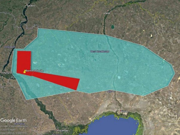 Вероятно, сейчас проходят летные испытания «Буревестника» на полигоне Капустин Яр. Две зоны закрыты для полетов авиации на период с 22-27 июня с 8:00 до 23:00. Эти зоны отмечены красным, а синим цветом – постоянная бесполетная зона над полигоном