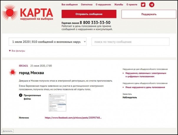 На «Карте нарушений» опубликовали фальшивку москвички Березовской о голосовании по поправкам в Конституцию