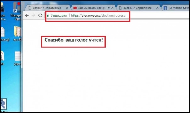 Во-вторых, при переходе на сайт elec.moscow пользователь получает сообщение о том, что данной страницы не существует. Зато если ввести адрес со скриншота Березовской на экран, будет выведено сообщение «Спасибо, ваш голос учтен!». Продуманный ход, чтобы придать подделке достоверности.