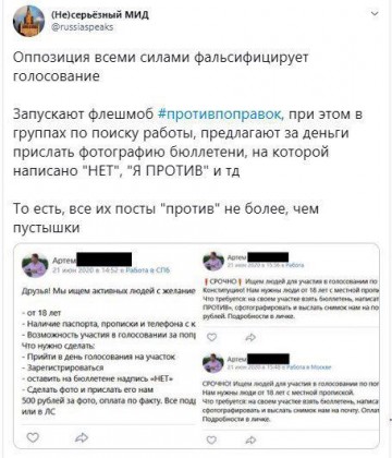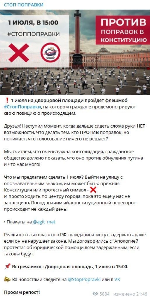 В последний день голосования по поправкам спекулянты пошли ва-банк и решили использовать жителей Северной столицы в качестве пушечного мяса. Противники внесения изменений в Основной закон толкают на преступление горожан. Массовые мероприятия в городе до сих пор под запретом из-за распространения коронавируса. Кроме того, организация флешмоба попадает под действие статьи 20.2 КоАП РФ.