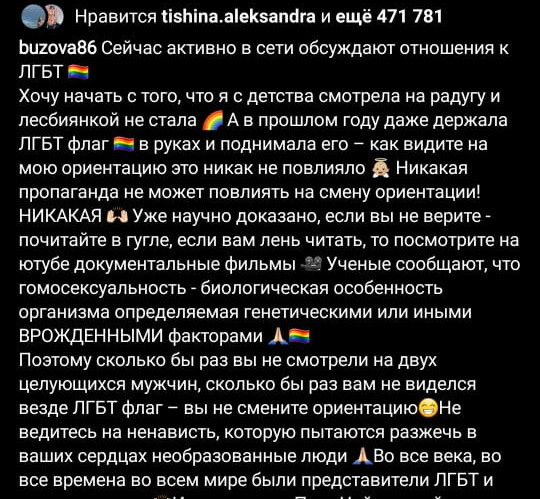 И вот тут тот момент, когда этой певице ртом надо было дернуть стоп-кран, дабы не подтверждать слухи о своем мягко говоря не слишком высоком уровне интеллекта.По ее словам, «научно доказано», что «гомосексуальность – биологическая особенность организма, определяемая генетическими или иными врожденными факторами». Бузова рекомендует «почитать в Google» информацию на эту тему, где якобы ученые доказали, что пропаганда никак не действует.