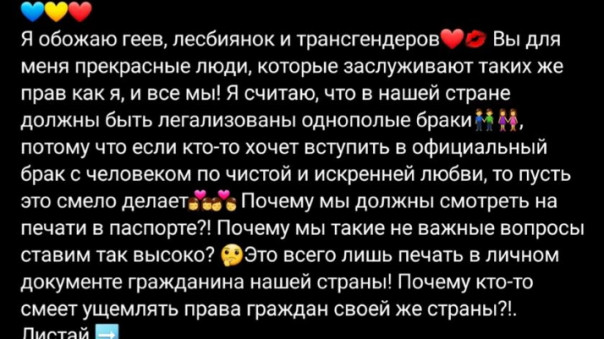 Также она высказала мнение, что в России следует легализовать однополые браки. «Я обожаю геев, лесбиянок и трансгендеров. Вы для меня прекрасные люди, которые заслуживают таких же прав, как я, и все мы! Я считаю, что в нашей стране должны быть легализованы однополые браки», – написала она на своей странице в Instagram.